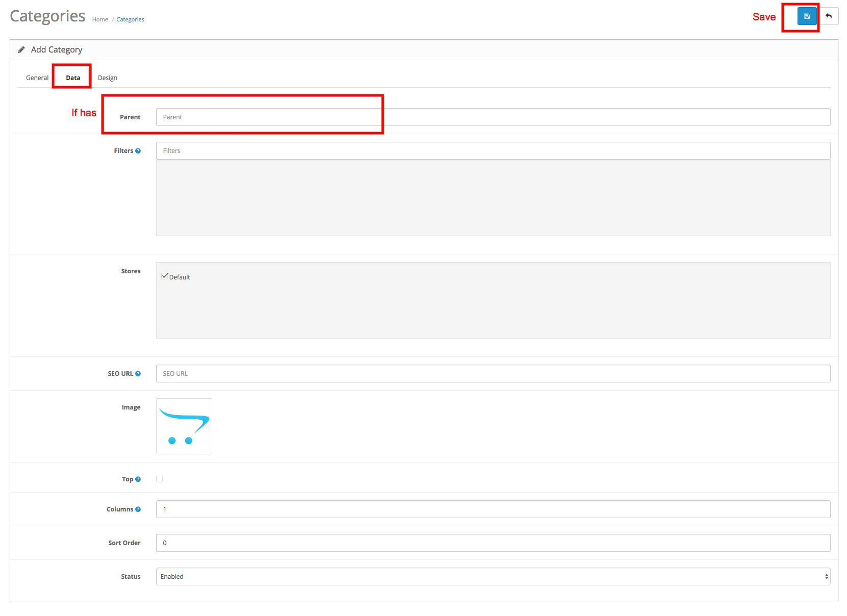 Stores: If you are managing more than one store with OpenCart, you may check which stores you would like to add this category to. If only one store is available, "Default" may be checked. See Creating a multi-store for more information about multi-stores.